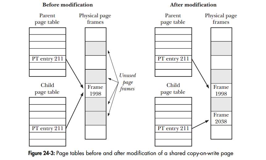 - 对于父进程数据段、堆段、和栈段中的各页,内核采用写时复制技术