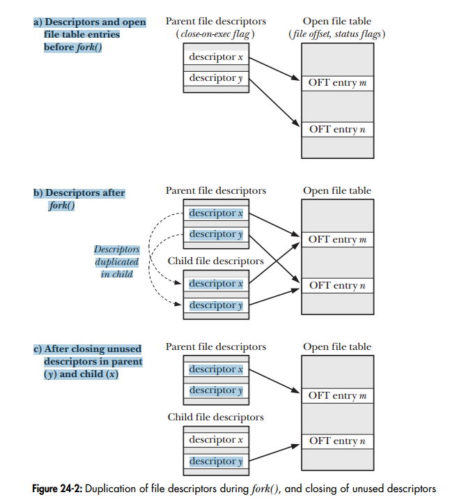 - 执行fork时,子进程会获得父进程所有文件描述符的副本.这些副本的创建方式类似于dup(),这也意味着子进程中的描述符均指向相同的打开的文件句柄。举例来说如果子进程更新了文件偏移量,会影响到父进程中相应的描述符