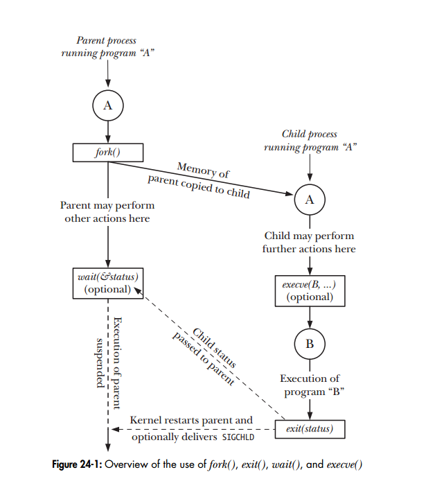 - fork() 允许一个进程创建一个子进程,子进程获得父进程的栈,数据段,堆和执行文本段